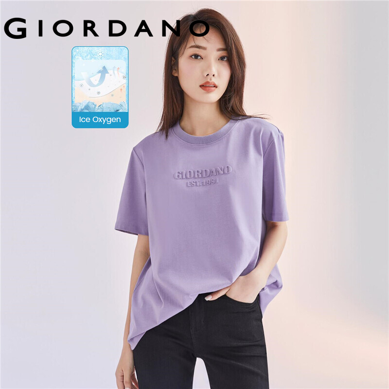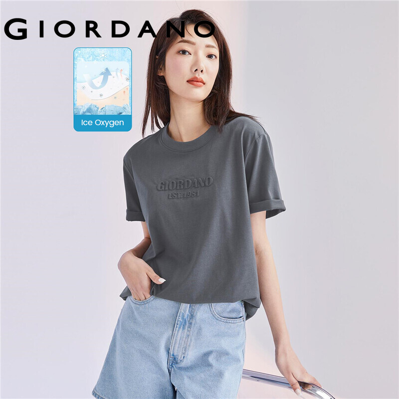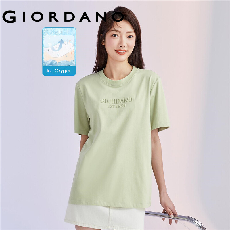 GIORDANO Women T-Shirts High-Tech Ice Oxygen Bar Crewneck Letter Embossed Casual Tee Short Sleeve Summer Basic T-Shirts 05322399